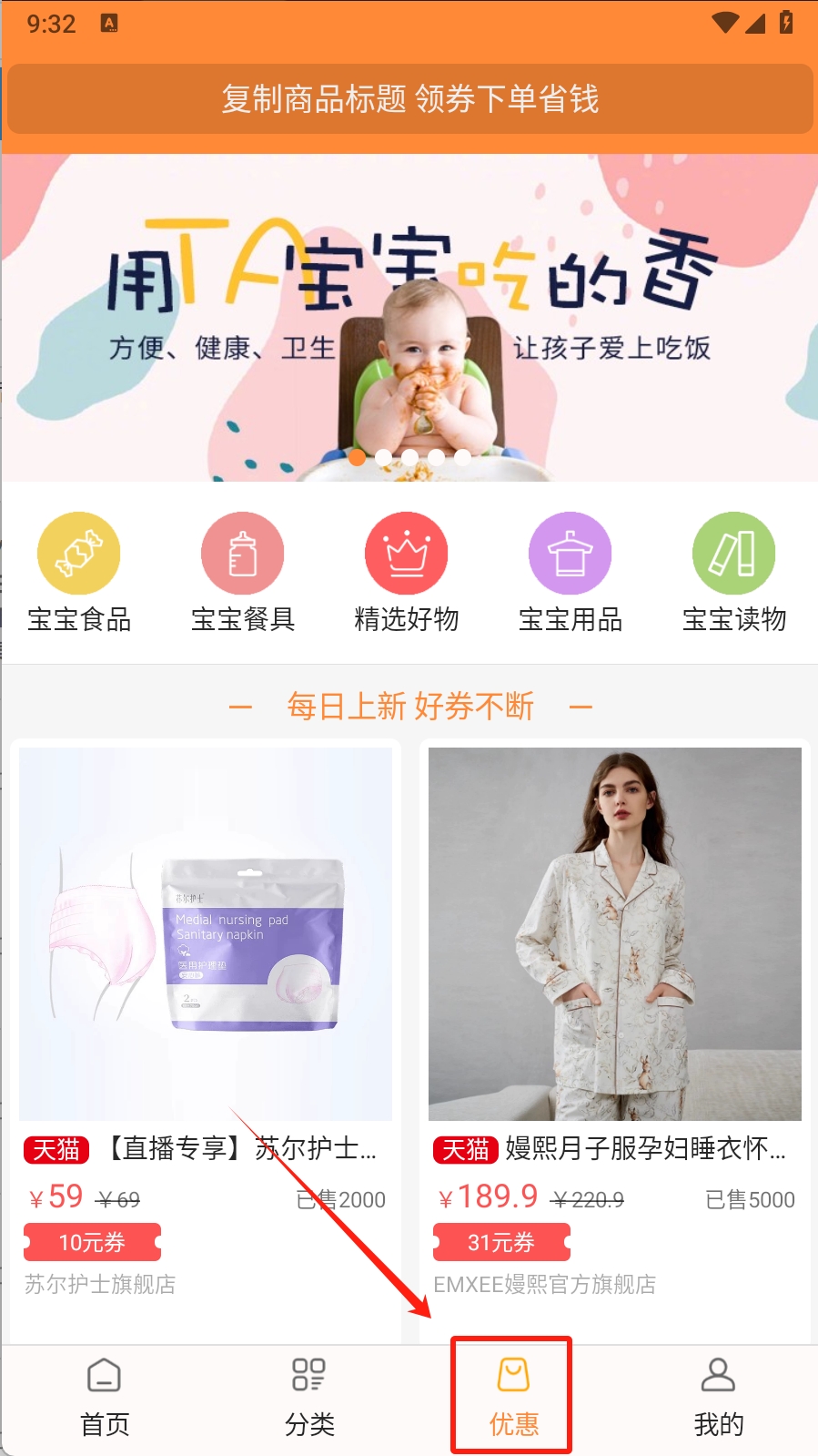 3、在优惠页面,浏览每日上新的优惠券和折扣商品。这样可以帮助你节省购物开支,获取更多优惠。