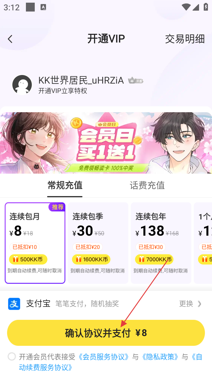 3、进入开通VIP页面后,选择充值方式,点击【确认协议并支付¥8】。