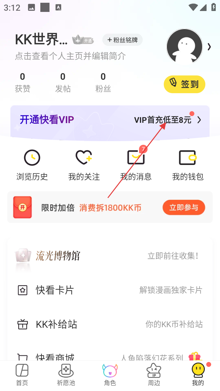 2、在个人相关页面,找到【开通快看VIP】选项并点击,进入开通VIP页面。