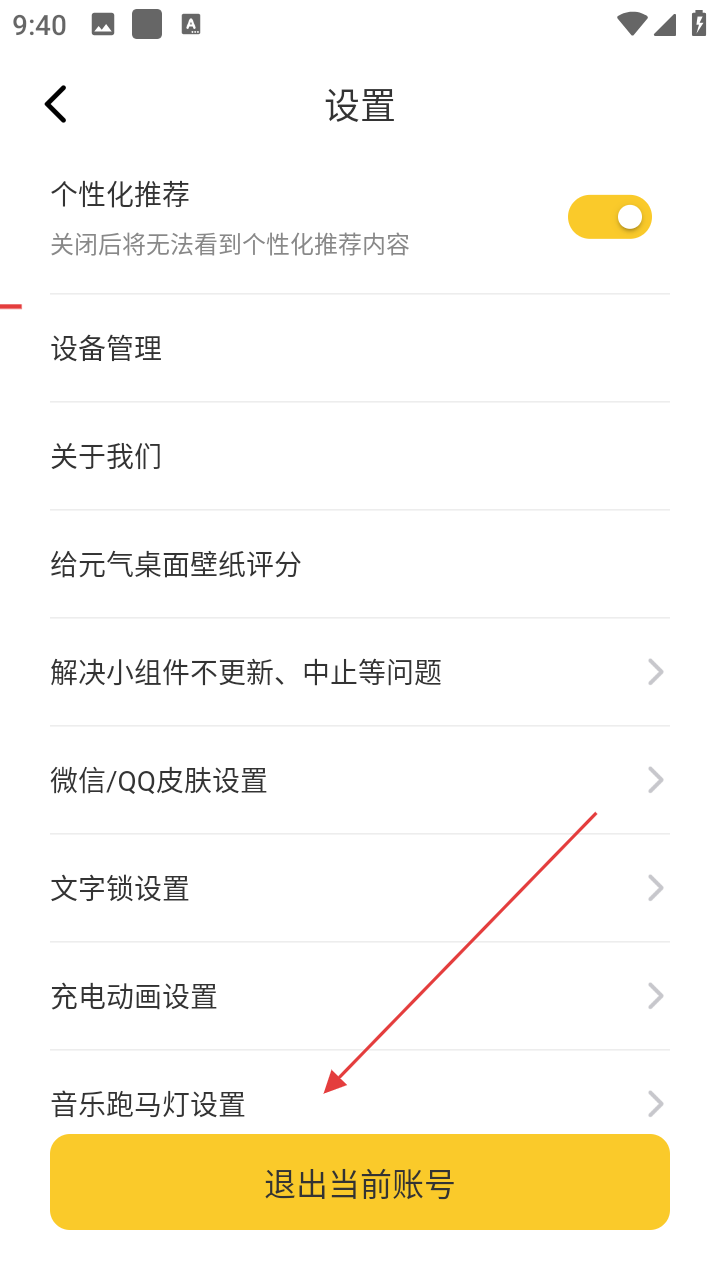 3、在设置页面,有设备管理、关于我们等选项,点击【音乐跑马灯设置】进入对应设置页面。