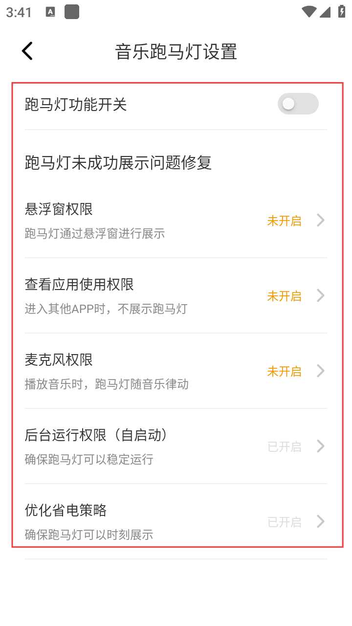 4、在音乐跑马灯设置页面,可对跑马灯功能开关、相关权限等进行设置,打造专属音乐跑马灯效果。