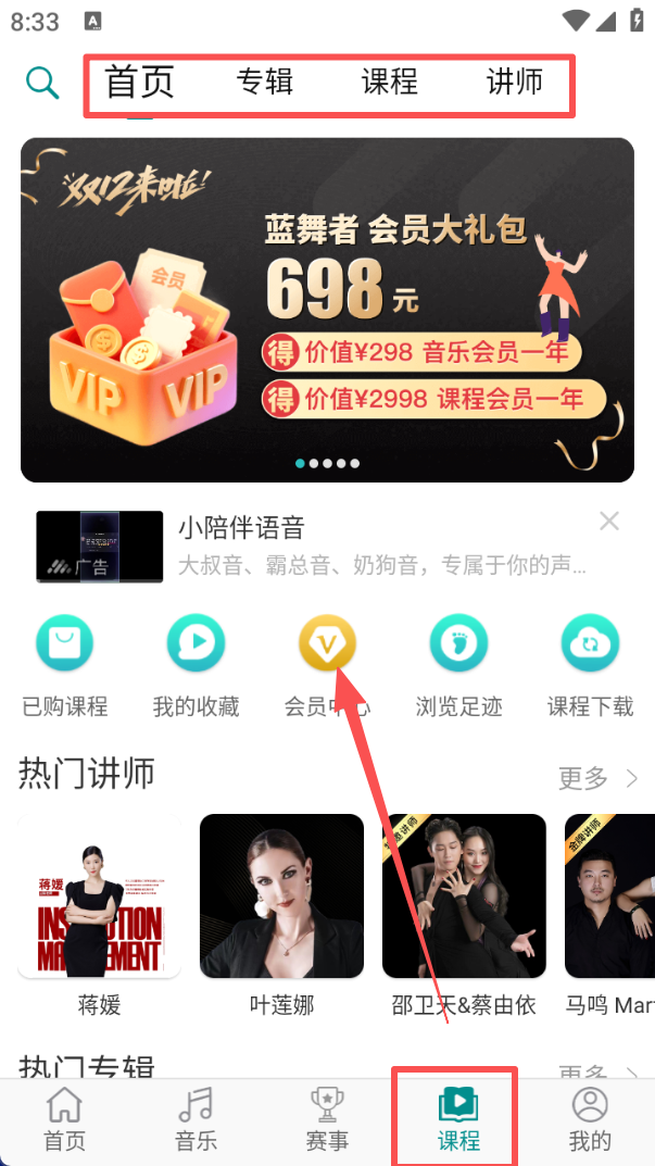 3、切换到 “课程” 页面,顶部有专辑、讲师等板块,下方可找到已购课程、我的收藏等功能,还能浏览热门讲师信息。