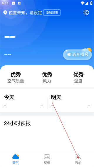 1、在天气主界面,点击底部“我的”选项,进入个人中心页面。