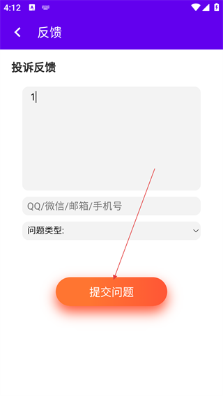 3、在投诉反馈页,在输入框中填写反馈内容,补充联系方式(QQ/微信等),并选择对应的问题类型。