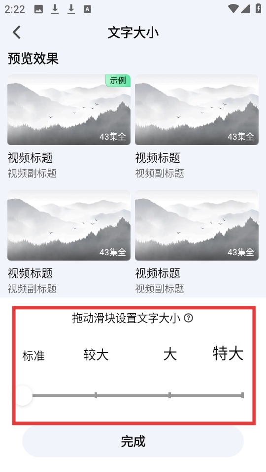 在文字大小设置界面,拖动滑块选择标准、较大、大、特大中的任意一个选项,然后点击【完成】按钮,就能完成文字大小的设置。