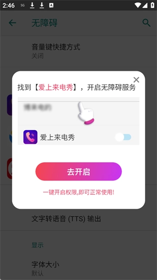 在进行设置前,我们得先进入设置界面,找到“爱上来电秀”这个选项,然后开启它的无障碍服务。