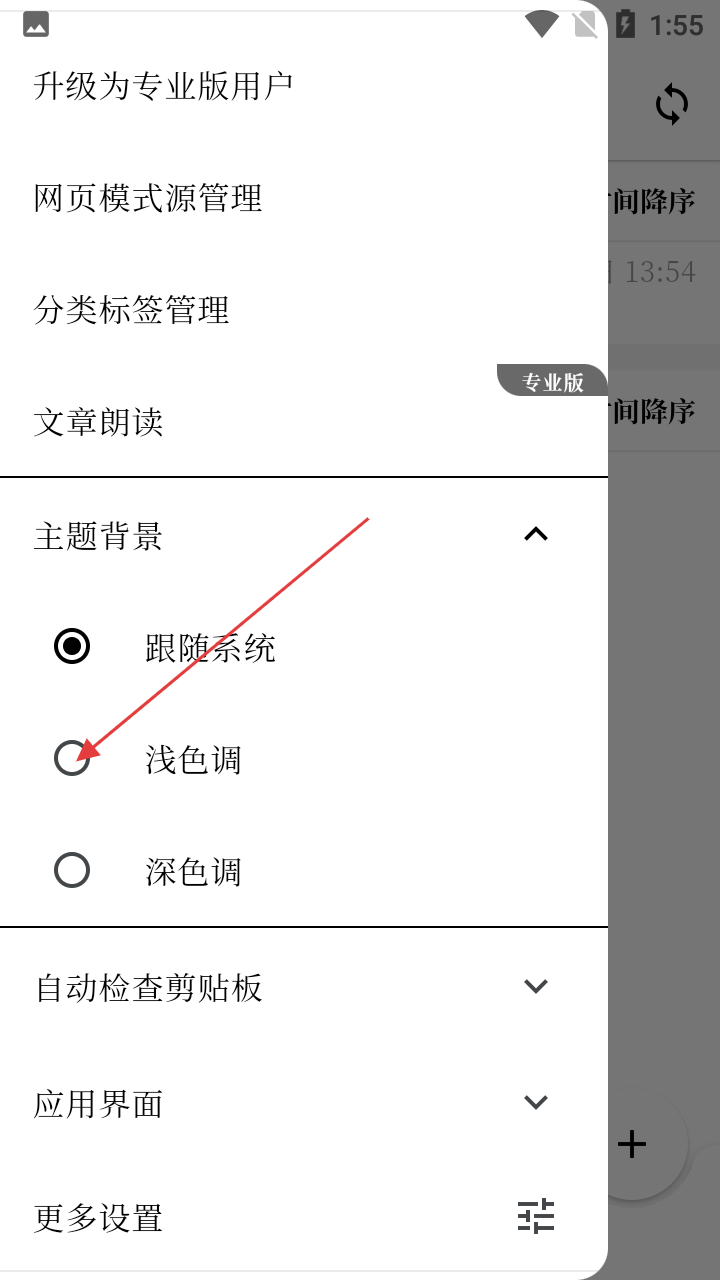 3、在主题背景设置列表中,可选择【跟随系统】【浅色调】【深色调】等主题模式,点击【浅色调】可切换到浅色调主题。