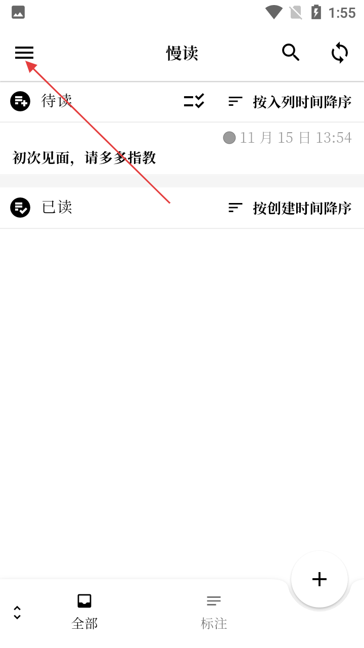 1、在慢读主界面,点击左上角三条横线图标可打开功能菜单。