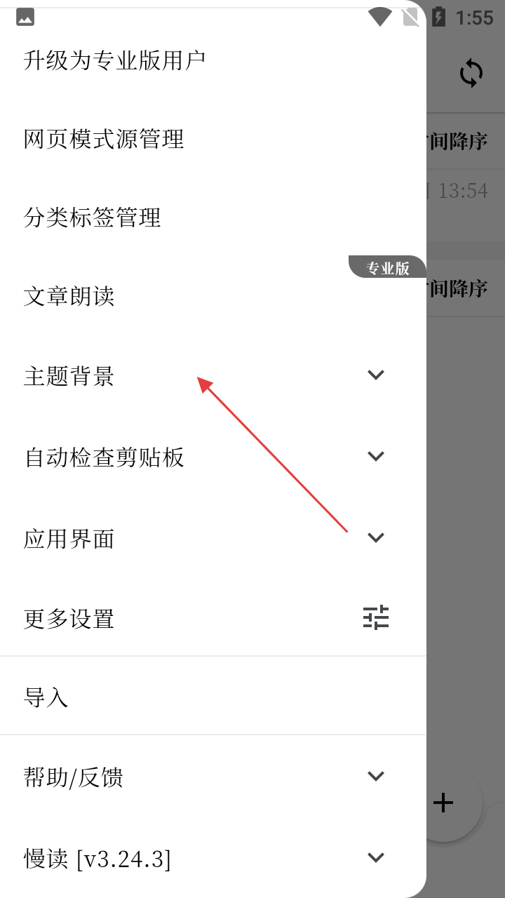 2、打开功能菜单后,点击【主题背景】选项可展开主题背景设置列表。