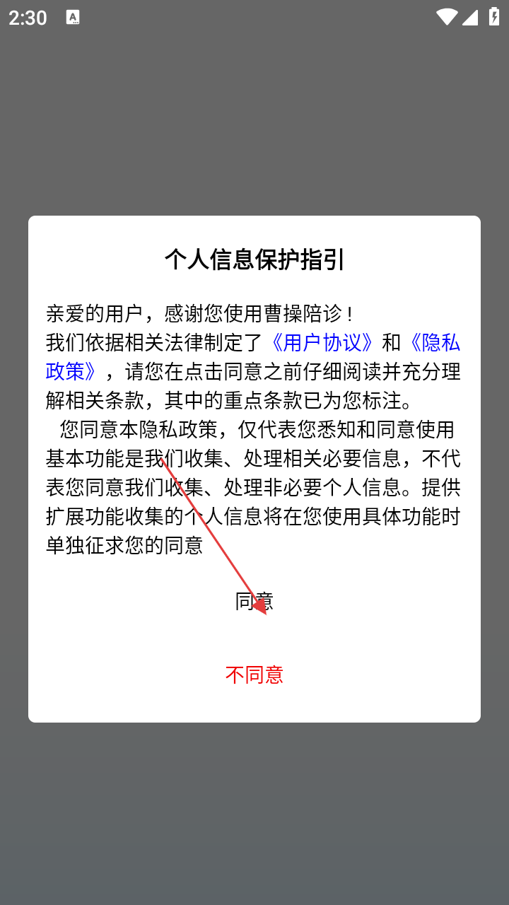 1、打开曹操陪诊APP,阅读【个人信息保护指引】后,点击【同意】进入登录页。