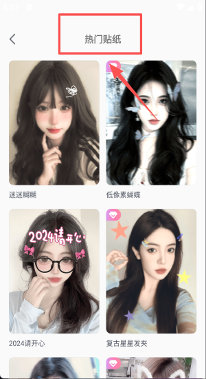 2、打开热门贴纸页,点低像素蝴蝶或复古星星发夹一键添加。