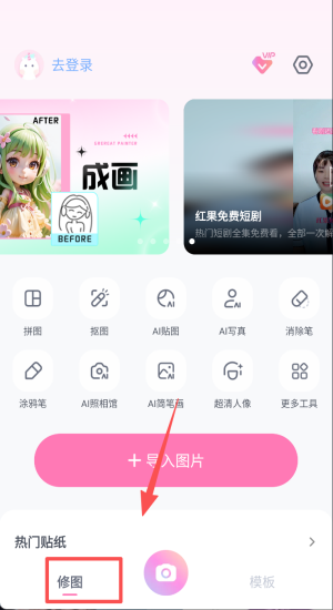 1、点击“去登录”进入主界面,先导入图片再选AI写真或消除笔。