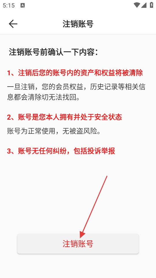 在设置页面中,选择【注销账号】这一选项,就能进入到注销确认的界面。