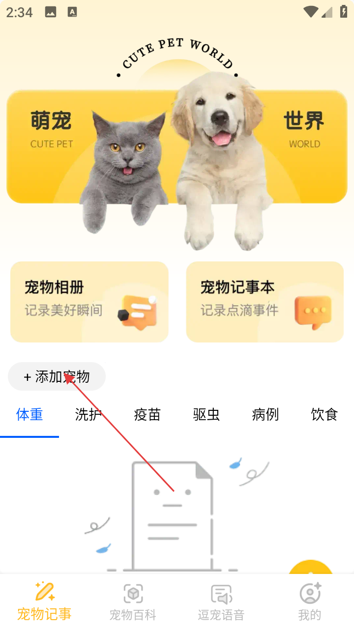 2、在档案页,点击底部【添加宠物】按钮,跳转选宠物类型。
