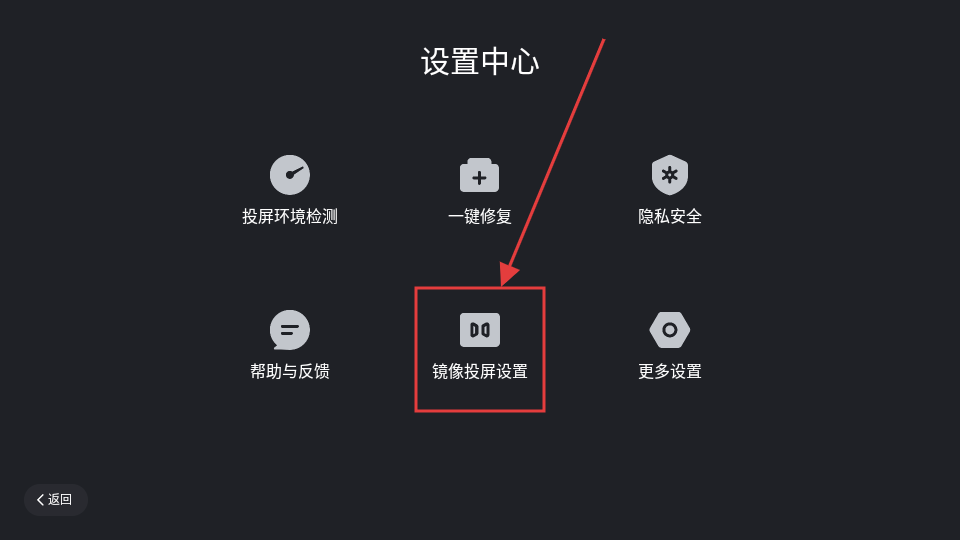 2、进入设置中心后,点击【镜像投屏设置】,可进入镜像投屏设置页面哦。