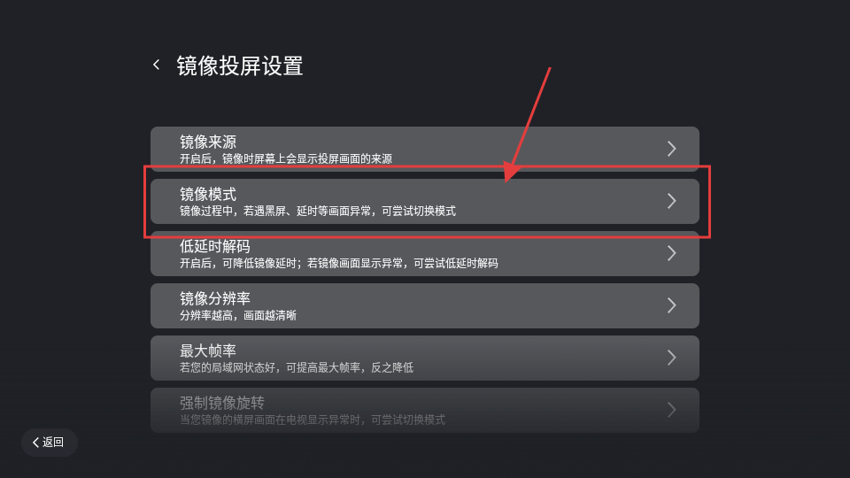 3、在镜像投屏设置页面,点击【镜像模式】,可进入镜像模式选择页面啦。