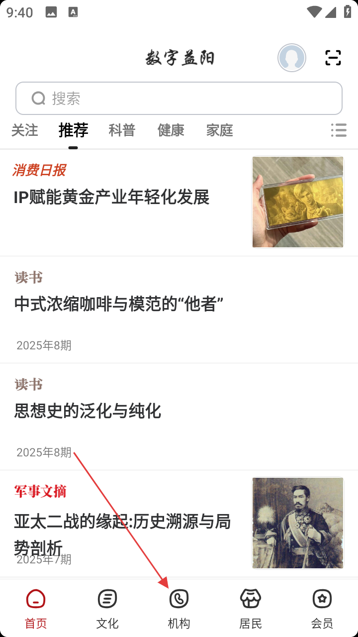 1、打开【数字益阳】,点击底部【机构】,进入机构分类页。
