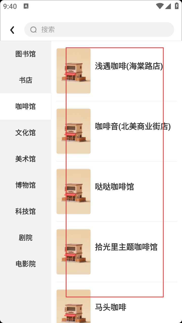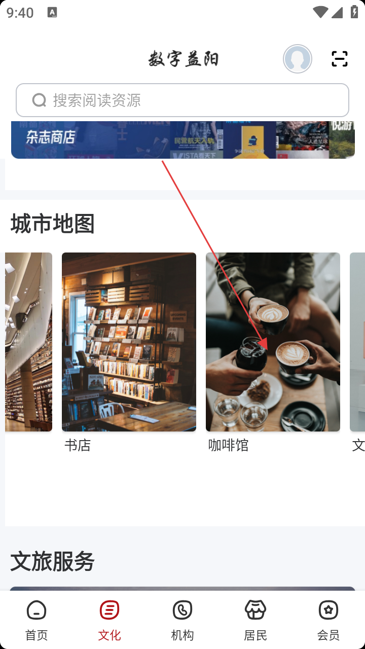 2、切换到【文化】页,在城市地图选【咖啡馆】,查看列表。
