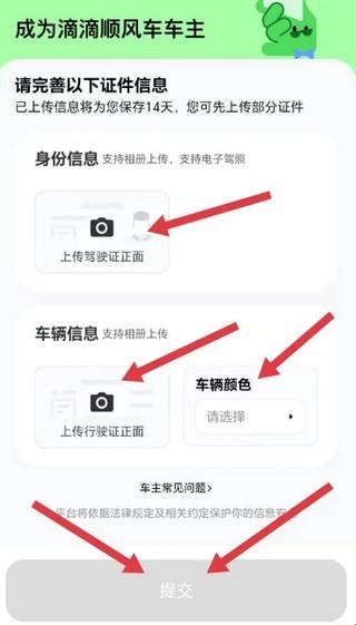 2、根据平台提示,将驾驶证、行驶证等材料拍照上传,点击提交。