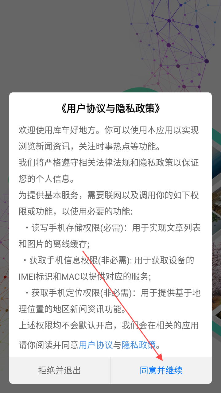 1、打开应用,查看《用户协议与隐私政策》,点击【同意并继续】。
