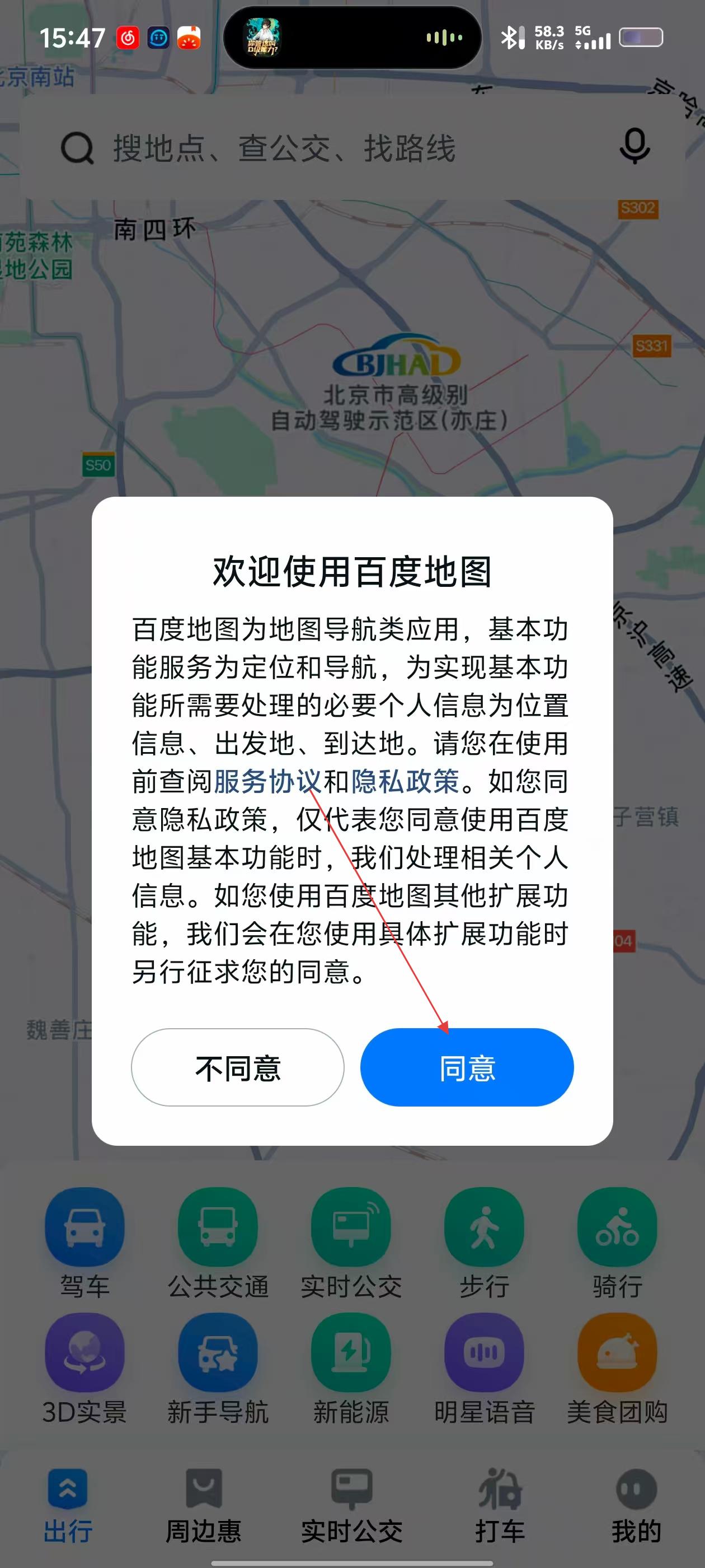 1、打开百度地图APP,首先会看到“欢迎使用百度地图”页面,仔细阅读相关内容后,点击【同意】按钮。