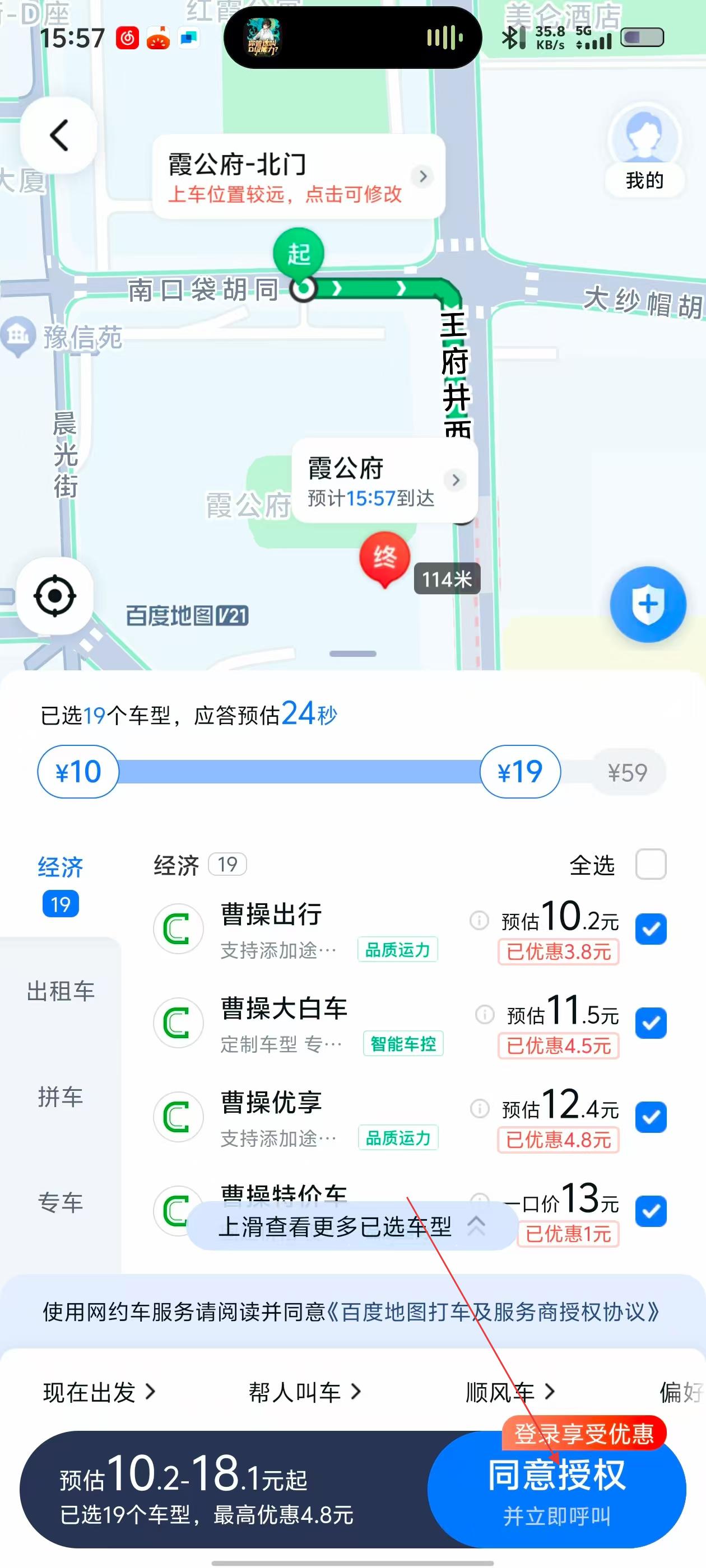 4、输入目的地后,会显示相关车型及预估价格等信息。若要呼叫车辆,需点击【同意授权 并立即呼叫】按钮,按照提示完成后续打车操作。