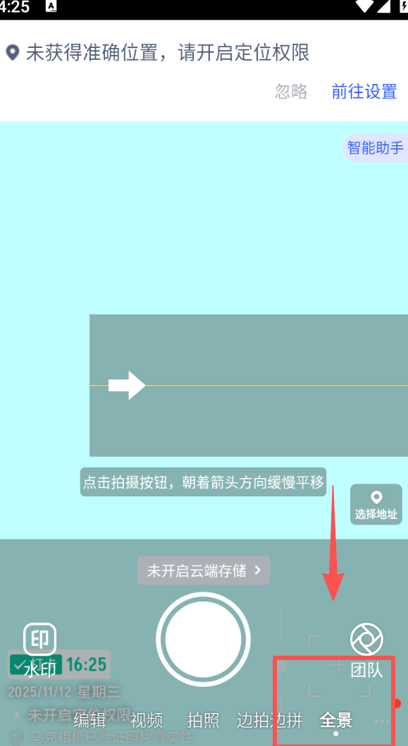 3、点击 “全景” 功能,按照提示朝着箭头方向缓慢平移拍摄,可制作全景照片。