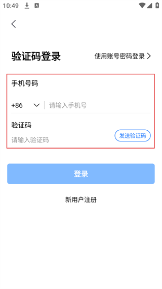 4、在验证码登录页面,输入手机号码,点击【发送验证码】,填写收到的验证码后点击【登录】,完成账号登录。