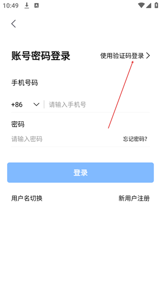 3、在登录界面,点击右上角【使用验证码登录】选项,切换至验证码登录页面。