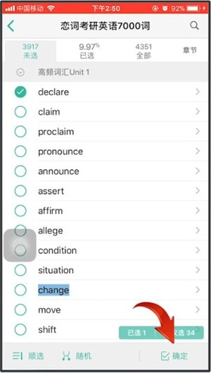 在书籍列表里挑选你想要的词汇书,进入单词页面后,勾选任意单词,再点击“确定”按钮,这样就完成操作啦。