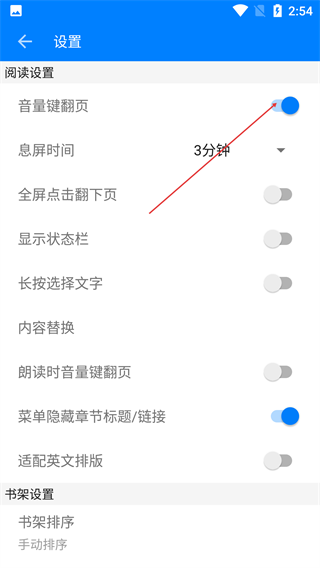 3、在设置页面的“阅读设置”区域,找到“音量键翻页”功能,点击其右侧开关,可关闭该功能。