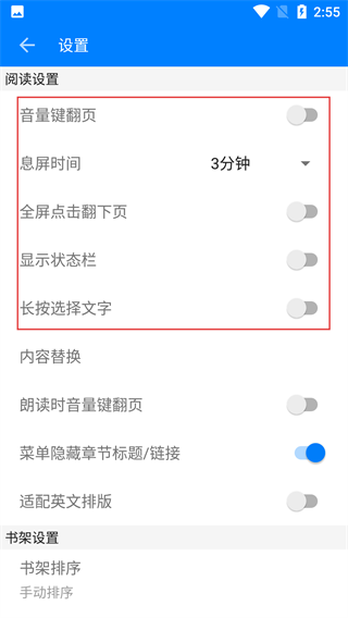4、设置页面支持调整多项阅读相关功能(如息屏时间、全屏翻页等),可根据阅读习惯自定义配置,优化阅读体验。