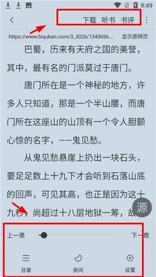 在阅读时轻触屏幕中央,就能调出目录、开启听书功能、缓存章节,还可以切换夜间阅读模式,进行多种个性化设置。