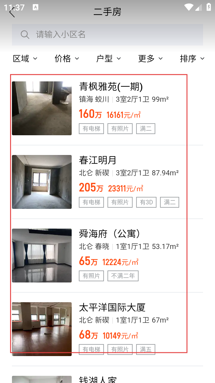 1、进入应用首页,点击【二手房】,进入二手房列表页选心仪房源。