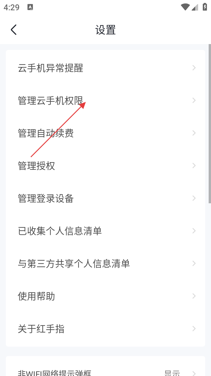 3、在设置页面,点击【管理云手机权限】选项,可进入手机号登录注册页面。