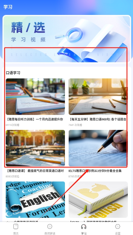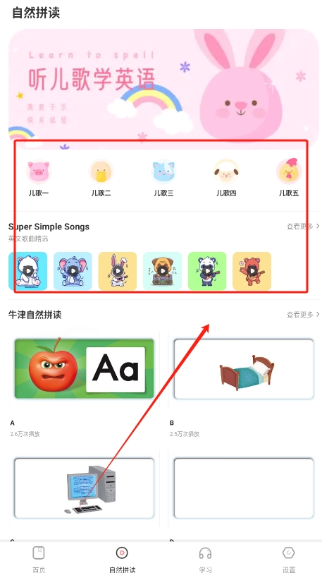 1、通过主界面选择学习模块,包括歌曲,视频或儿童专区,根据个人需求点击进入对应栏目。