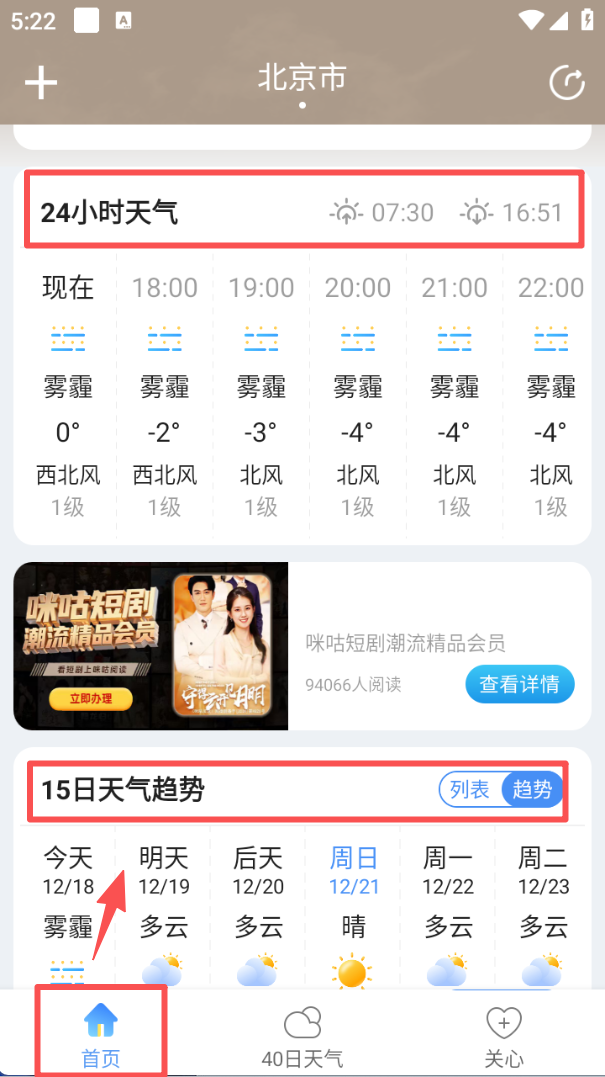 2、在首页能查看所选城市的 24 小时天气变化,同时可浏览 15 日天气趋势,了解近期的气象状况。