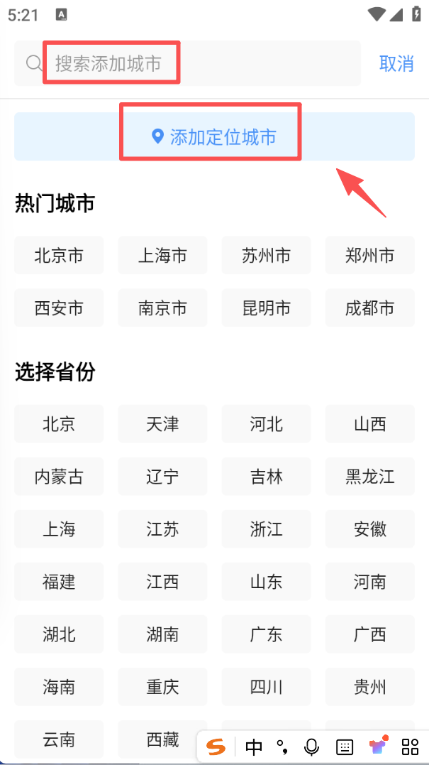 1、进入城市添加页面,可通过搜索框查找城市,也能点击 “添加定位城市” 获取当前所在地,还能选热门城市或省份。
