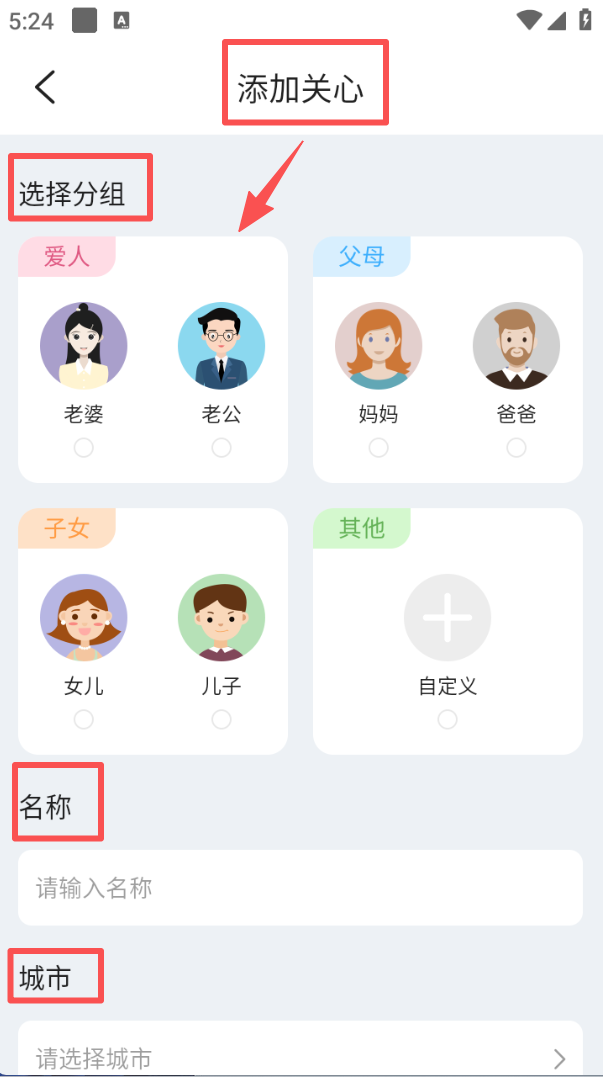 4、进入 “添加关心” 界面,选择分组、填写名称并选定城市,即可添加对应联系人的关联城市天气。
