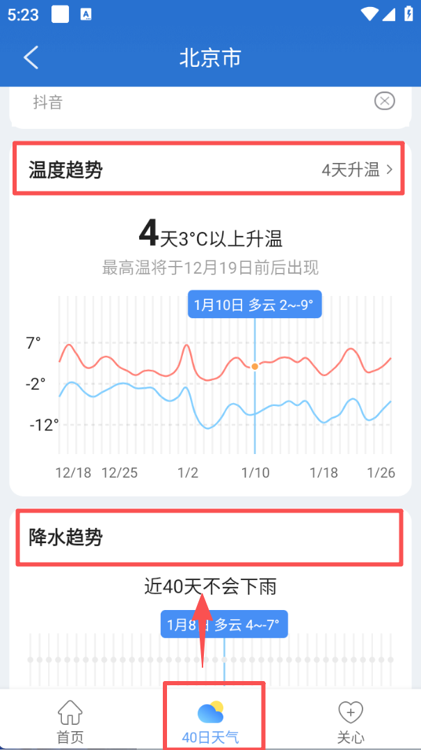 3、切换到 “40 日天气” 页面,能查看温度趋势的升降变化,也可了解降水趋势,掌握长期气象走向。