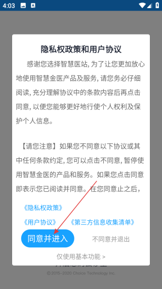 1、打开应用查看协议点击同意并进入。