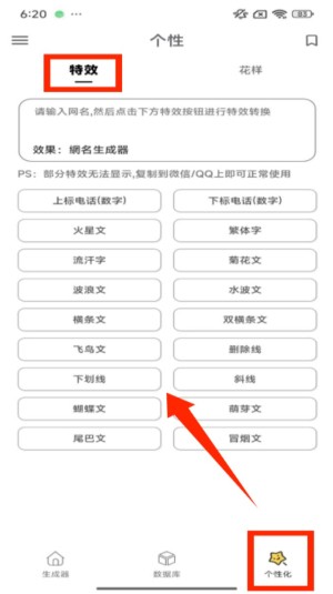 2、点击底部 “个性化” 选项,切换至 “特效” 标签,在输入框填写网名后,可选择上标电话、火星文等特效样式转换。