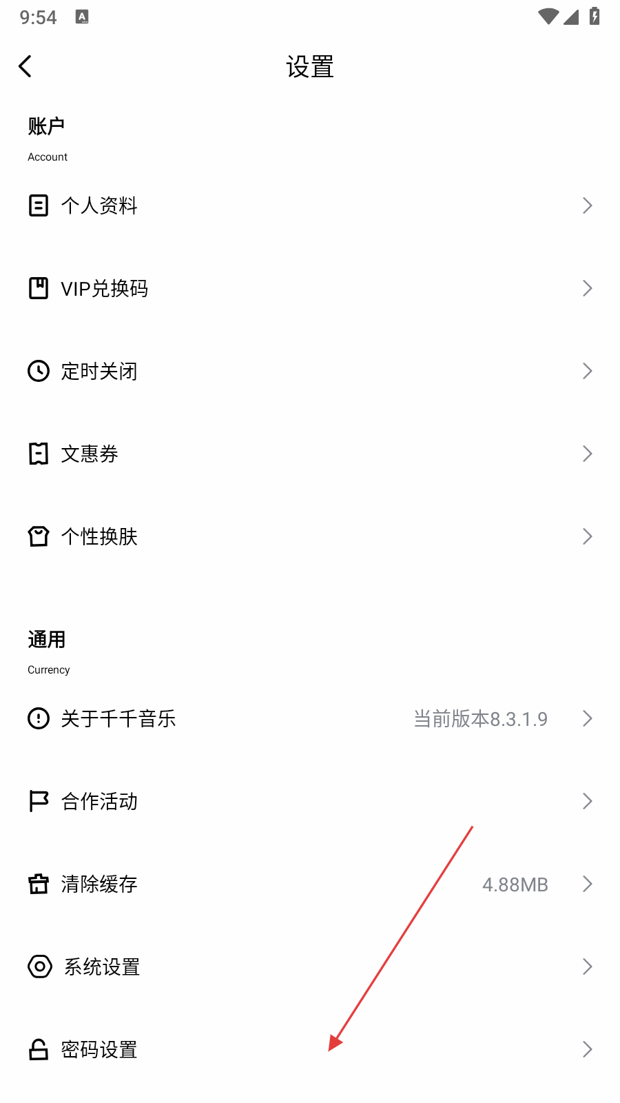 2、在个人中心页面点击右上角设置图标,进入设置页面,可看到密码设置等设置项。