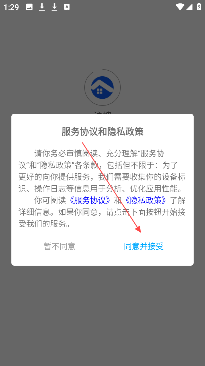 1、首次打开【沪嫂】,读【服务协议和隐私政策】后,点【同意并接受】用软件。
