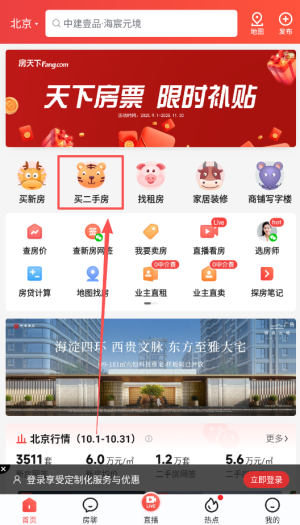1、打开房天下APP,在首页点击【买二手房】,进入二手房专区。