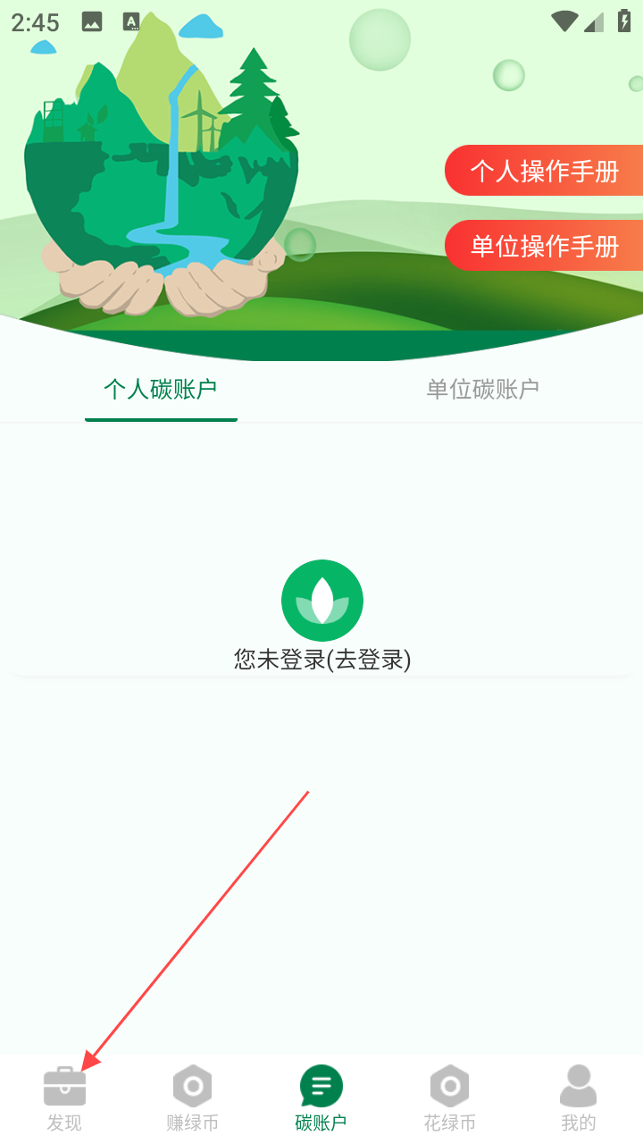 1、打开绿疆碳汇,在底部导航点【发现】,进入活动推荐页。