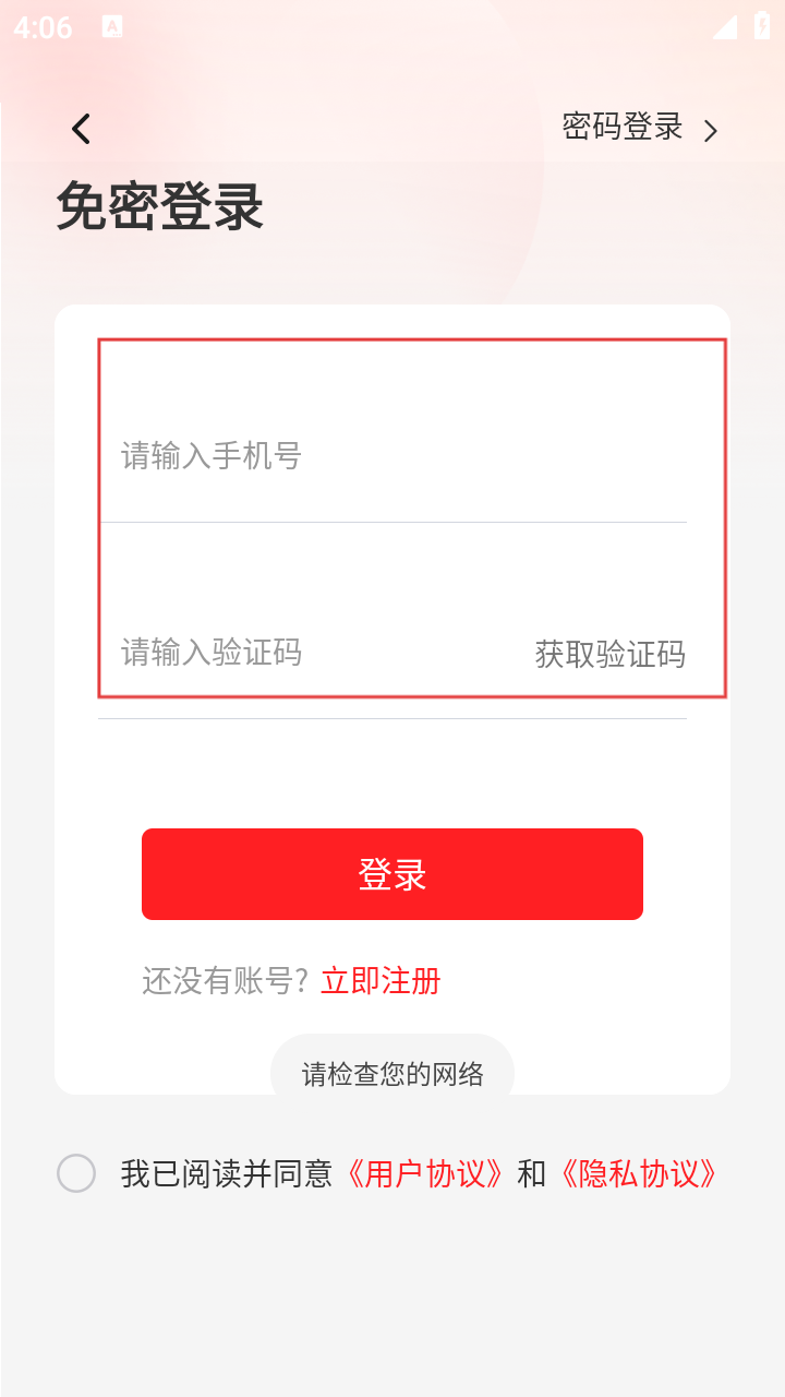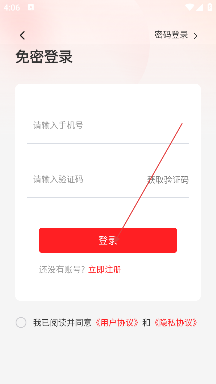 3、选择免密登录,按要求填手机号、验证码,勾选协议。