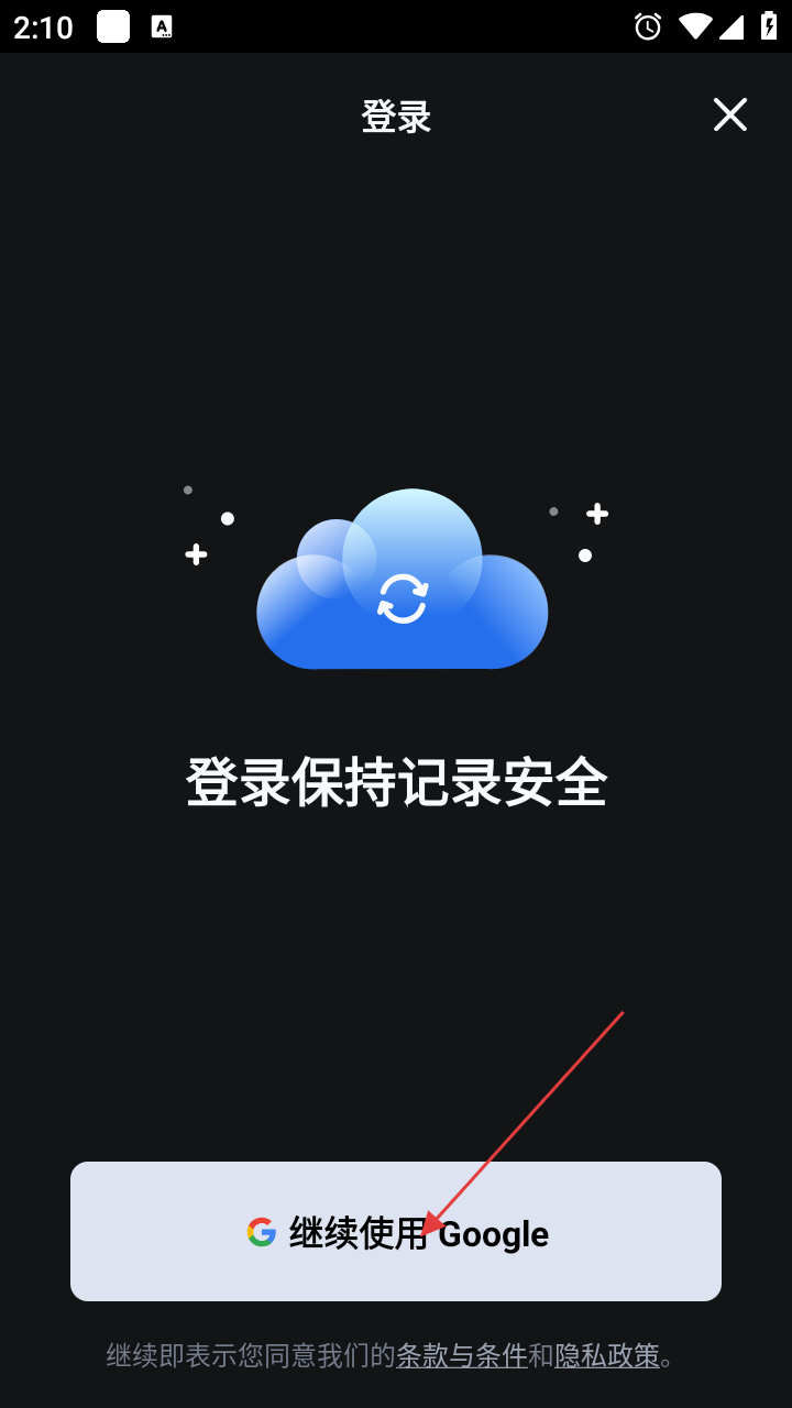 4、在登录界面,点击【继续使用Google】按钮,可通过Google账号登录,保持记录安全。