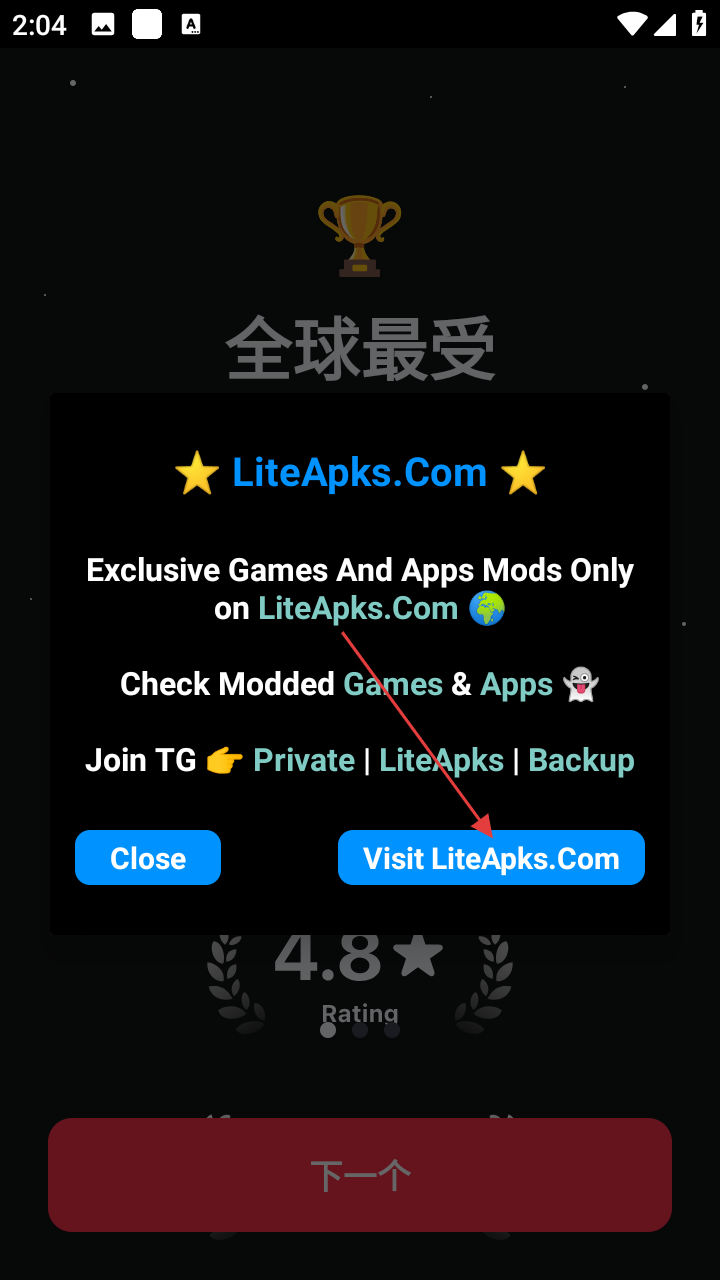 1、若看到LiteApks.Com相关弹窗,可点击【VisitLiteApks.Com】进入,继续使用软件其他功能。