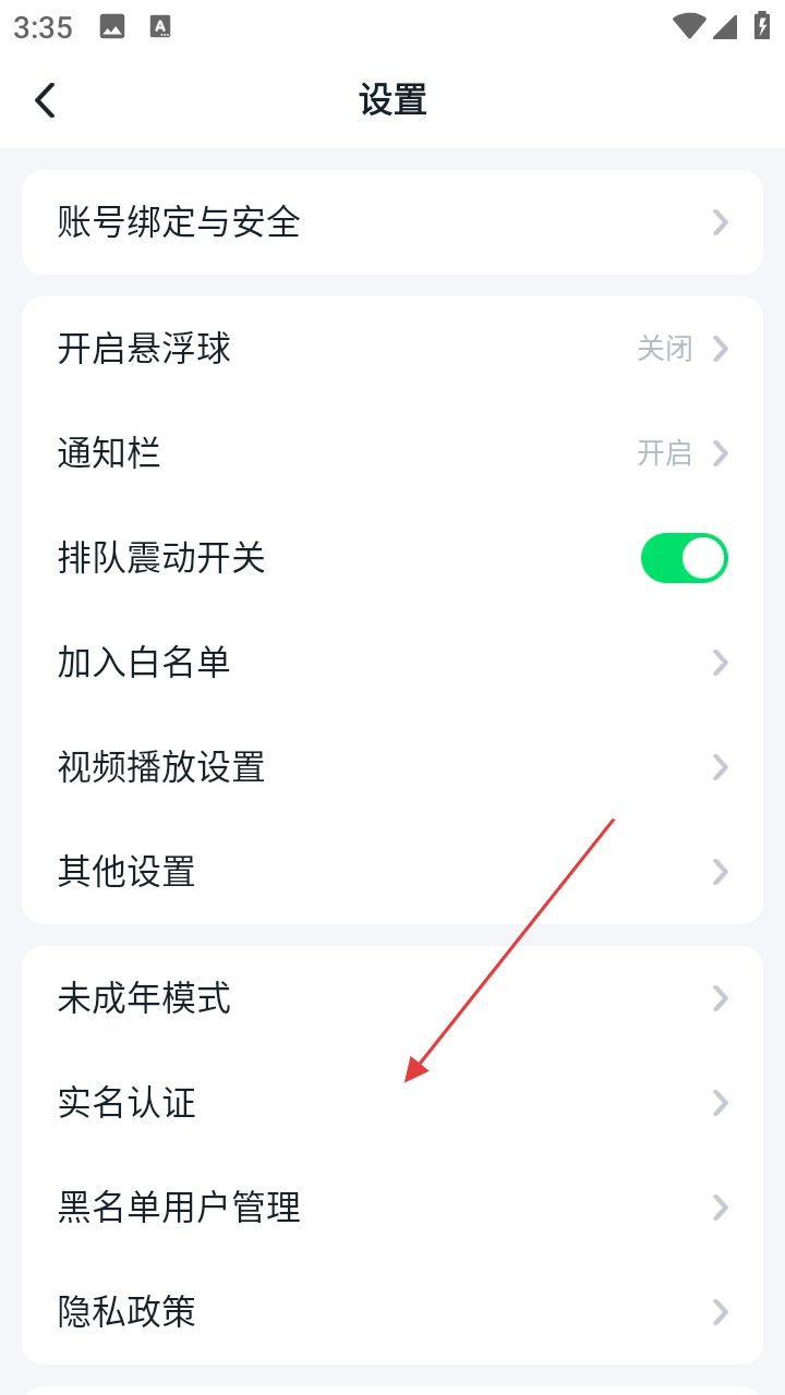 3、在设置页面,若要进行实名认证,点击【实名认证】,进入实名认证页面。